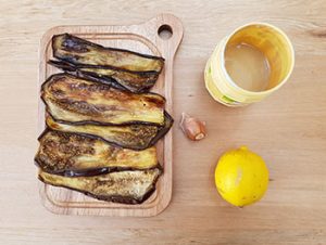 *Para asar la berenjena, la cortamos en rebanadas de alrededor de 2 cm de espesor a lo largo, pincelamos cada rebanada con aceite de oliva por los dos lados. Horneamos en una plancha para horno a 200°C por 10 minutos, las volteamos y horneamos por 10 minutos más. Podemos poner los dientes de ajo enteros y pincelados con aceite de oliva por los últimos 10 minutos junto a la berenjena o bien usarlos crudos.