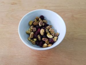 Pasada la hora está listo para armar una tabla. Desnudo se ve muy bien, pero si lo queremos cubrir picamos los pistachos y cranberries con un cuchillo grande, y ponemos sobre una tabla