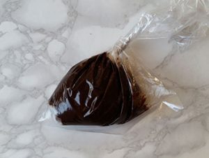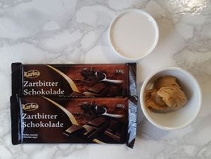 Calentamos la leche. Agregamos la mantequilla de maní y revolvemos hasta disolver. Cuando tengamos una ‘leche de maní’, agregamos el chocolate picado y revolvemos hasta que se disuelva por completo.