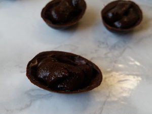 Con el resto del chocolate derretido, ponemos un poco en el borde de un huevito, y lo pegamos con otra mitad, limpiamos los bordes, dejamos secar.